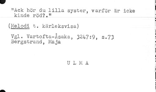 //// (Melodi t. kärleksvisa) //// = //// Vgl. Vartofta-Åsaka, 3247:9, s.73 ^ //// Bergstrand, Maja ^ //// i //// i //// U L M A ' //// ! //// i //// a //// n //// H //// t- //// : ////