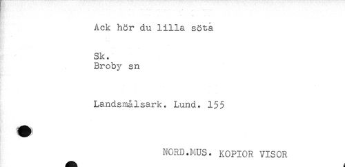 //// Ack hör du lilla söta //// ^ Sk. //// Broby sn //// Landsmålsark. Lund. 155 //// NORD.MUS. KOPIOR VISOR ////
