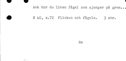 //// Ack hör du liten fågel som sjunger på gren... //// j ^ B 40, s.72 Flickan och fågeln. 3 str. //// I Ra //// t //// /.....-. ////