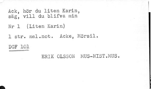 //// Ack, hör du liten Karin, //// säg, vill du blifva min ] //// Nr 1 (Liten Karin) ] //// 1 str. mel.not. Acke, Mörsil. j //// DGF 101 ! //// ERIK OLSSON MUS-HIST.MUS. ////
