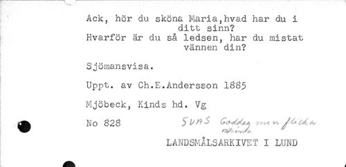 //// Ack, hör du sköna Maria,hvad har du i //// ditt sinn? //// Hvarför är du så ledsen, har du mistat //// vännen din? //// Sjömansvisa. //// Uppt. av Ch.E.Andersson 1865 //// Mjöbeck, Kinds hd. Vg //// ^ No 828 ) ^ ^ ^ . //// ! //// LANDSMÅLSARKIVET I L