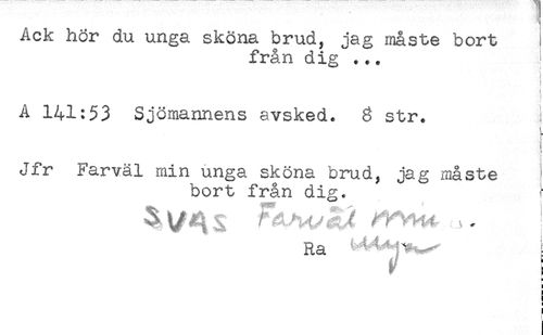 //// ACK Ror du unga sköna brud, jag måste bort //// från dig ... i //// t //// ! //// < //// ! //// < //// A 141:53 Sjömannens avsked. 8 str. //// t //// Jfr Farväl min unga sköna brud, jag måste i //// bort från dig. ^ //// Ra ^ ^^ //// - //// i ////