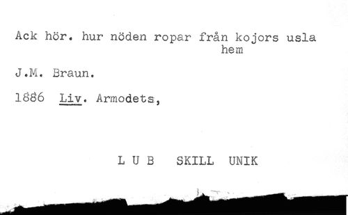 //// Ack hör. hur nöden ropar från kojors usla //// hem //// J.M. Braun. //// 1886 Liv. Armodets, //// L U B SKILL UNIK //// $ t .. . ..... //// -- -- å tiHMHHM)! [åtal])! )T //// ... ^^^^^HjMHH^HMHHM ////