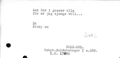 //// t' . ... //// § - " - //// Ack hör i gossar alla //// för er jag sjunga vill... //// i //// Sk //// Stoby sn //// ^SvA //// " NORD.MUS. //// Mskpt.Soldatsånger I s.269. //// E.U. 17^60 //// å å ////
