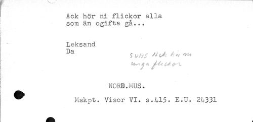 //// Ack hör ni flickor alla //// som än ogifta gå... //// i //// Leksand //// TTtiQ //// NORD.MUS. //// : //// ^ Mskpt. Visor VI. s.415* E.U. 24331 ////