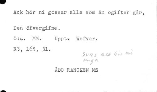 //// Ack hor ni gossar alla som än ogifter går, //// ; //// Den öfvergifne. I //// 6:4. MM. Upptv Wefvar. //// R3, 16$, 31. //// ÅBO RANCKEN MS //// ^^^-^^^ ////