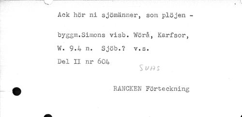 //// Ack hör ni sjömänner, som plöjen - //// byggm.Simons visb. Wörå, Karfsor, //// W. 9.4 n. Sjöb.? v.s. //// Del II nr 604 //// S t^-: //// ^ RANCKEN Förteckning ////