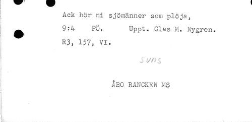 //// Ack hör ni sjömänner som plöja, //// ) ^ 9:4 PC. Uppt. Clas M. Nygren. //// R3, 157, VI. //// ÅBO RANCKEN MS //// !f //// i //// t //// ; //// ) ////