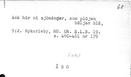 //// Ack hör ni sjömänger, som plöjen //// böljan blå, //// - ' * t ' //// 9:2. Nykarleby, MU. OR. S.L.S. 19. //// s. 460-461 nr 179 //// ÅBO //// H //// H //// 5 //// r* ////