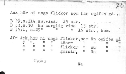//// Ack hör ni unga flickor som här ogifta gå... //// -- - t //// ! //// B 29,s.314 En.visa. 15 str. //// B 53,s.30 En sorglig visa 15 str. //// B 55:1, S.29" " " 15 str., kom. //// Jfr Ack,hör ni unga flickor,som än ogifta gå //// Y " " töser '' " " " /