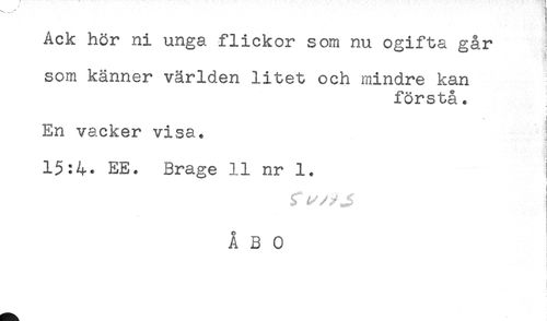 //// Ack hör ni unga flickor som nu ogifta går //// som känner världen litet och mindre kan //// förstå. //// - //// i //// En vacker visa, //// 15:4. EE. Brage 11 nr 1. //// f //// ÅBO //// i //// ! ////