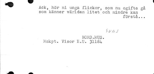 //// ACK, nor ni unga luckor, som nu ogifta gå //// som känner världen litet och mindre kan //// förstå... //// NORD.MUS. //// Mskpt. Visor E.U. 31184 ////