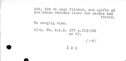 //// Ack, hör ni unga flickor, som ogifta gå //// Som kanna världen litet och mindre kan //// förstå. //// En sorglig visa. //// 15:4. PA. S.L.S. 277 s.723-726 //// nr 67. ////