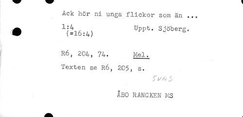 //// Ack hör ni unga flickor som än ... //// - //// R6, 204, 74. Mel. //// Texten se Rå, 205, s. //// ÅBO RANCKEN MS ////
