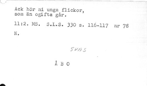 //// Ack hor ni unga flickor, //// som än ogifta går. //// 11:2. MS. S.L.S. 330 s. 116-117 nr 78 //// N. //// ÅBO ////