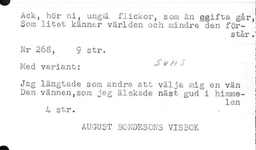 //// ACK, nor ni, ungaL iiickor, som än ggifta går,! //// Som litet känner världen och mindre den för- //// står .' //// ) //// Nr 268, 9 str. ; //// < //// Med variant: ; //// t //// f //// Jag längtade som andra att välja mig en vän } //// Den vännen,so