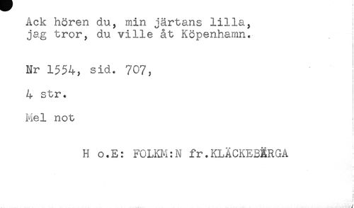 //// ACK noren du, mm jartans lilla, //// jag tror, du ville åt Köpenhamn. //// < //// Nr 1554, sid. 707, //// 4 str. //// Mel not //// i //// t //// H o.E: F0LKM:N fr.KLÄCKEBäRGA //// i //// t //// i ////