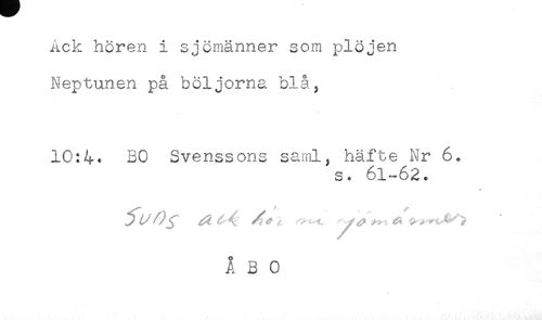 //// Ack hören i sjömänner som plöjen //// Neptunen på böljorna blå, //// 10:4* BO Svenssons saml, häfte Nr 6. //// s. 61-62. //// * ////