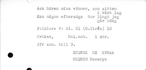 //// Ack hören mina vänner, som sitten //// i vårt lag //// Kan någon eftersäga Hur långt jag //// ! går idag //// Folklore V: bl. 61 (O.Tiren) 10 //// I Oviken, Mel.not. 1 str. //// i //// Jfr anm. till 9. //// ^ DYBECK MS KVHAA //// MOBERG Excerpt ////