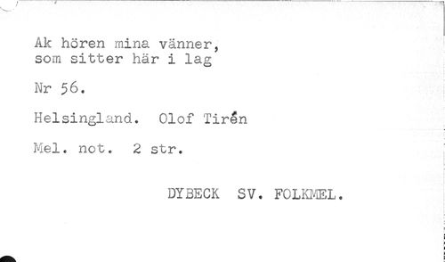 //// Ak hören mina vänner, i //// som sitter här i lag //// : //// ' * ] //// Nr 56. //// Helsingland. Olof Tirén //// t //// Mel. not. 2 str. //// ' //// t //// t //// i* //// ! //// t //// DYBECK SV. FCLKMEL. //// i //// ! //// t //// i //// } //// i //