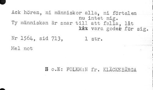 //// Ack hören, ni människor alla, ni förtalen //// nu intet mig. ; //// Ty människan är snar till att falla, låt i //// iåt vara gode^ för sig. 1 //// Nr 1564, sid 713, 1 str. I //// Mel not i //// i //// f //// r //// t //// t //// H o.E: F0LKM:N fr. KL