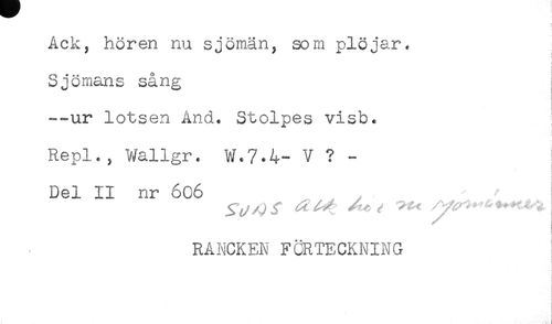 //// Ack, hören nu sjömän, som plöjar. //// Sjömans sång //// --ur lotsen And. Stolpes visb. //// Repl., Wallgr. W*7*4- V ? - ; //// < //// Del II nr 606 //// ! //// RANCKEN FÖRTECKNING //// < ////