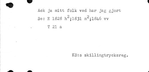 //// Ack ja mitt folk vad har jag gjort //// Se? E 1828 h^;l831 n^^l846 vv //// I. //// T 21 a //// * //// K3:s skillingtrycksreg. //// r //// i ////