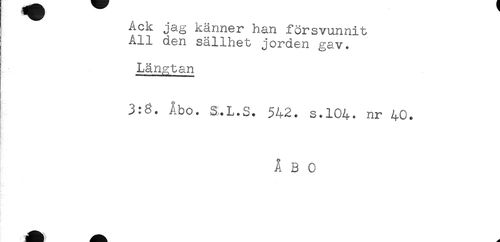 //// Ack jag känner han försvunnit //// All den sällhet jorden gav. //// Längtan //// 3:3. Åbo. S.L.S. 542. s.104. nr 40. //// ÅBO ////