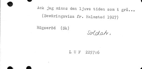 //// Ack jag minns den ljuva tiden som i grå... //// (Beväringsvisa fr. Halmstad 1927) //// Högseröd (Sk) //// L U F 2257:6 ////