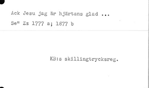 //// Ack Jesu jag år hjärtans glad ... //// Se" Zz 1777 a; 1877 b //// KB:s skillingtrycksreg. ////