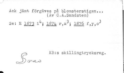 //// Ack jämt förgäves på blomsterstigen... //// (Av C.A.Sandsten) //// Se: E 1873 i^; 1874 1676 f,y,o^' //// KB:s skillingtrycksreg. //// ! //// * //// i //// 5 ////