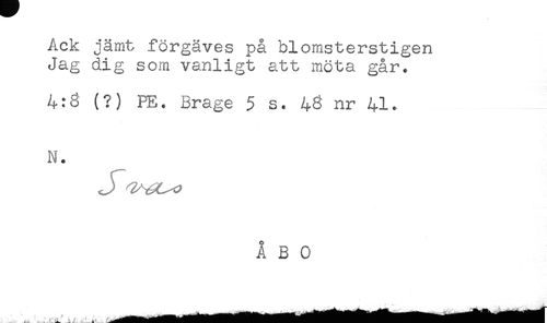 //// Ack jämt förgäves på blomsterstigen //// Jag dig som vanligt att möta gårY //// 4:8 (?) PE. Brage 5 s. 43 nr 41. //// N. //// ^ 4 'I'-*" ,, ////