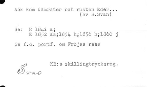 //// Ack Kom kamrater och rusten iLder... //// (av B.Svan) //// Se: R I64i a; //// E 1652 aa;l854 h;i856 h;l36o j //// Se f.ö. portf. om Fröjas resa //// ^ KB:s skillingtrycksreg. ////