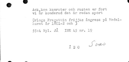 //// Ack,kom kamrater och rusten er fort //// vi är komderad det är redan sport //// Örlogs Fregattin fröjjas ångresa på Medel- //// havet år 1801-2 och 3 //// 55:4 Nyl. JÅ INE 45 nr. 19 //// ÅBO ^ ////