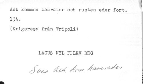 //// Ack kommen kamrater och rusten eder fort. //// 134. //// (Krigsresa från Tripoli) //// LAGUS NYL FOLK V REG ////