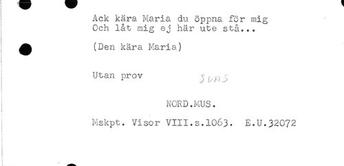 //// : Ack kara Maria du öppna för mig //// Och låt mig ej här ute stå... //// ^ (Den kära Maria) //// j //// I Utan prov //// NORD.MUS. //// t //// Mskpt. Visor VIII.s.1063. E.U.32072 //// < //// < ////