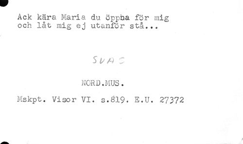 //// Ack kära Maria du öppha för mig //// och låt mig ej utanför stå... //// NCR D. MUS . //// Mskpt. Visor VI. s.8l9. E.U. 27372 ////