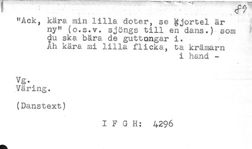 //// "Ack, kära min lilla doter, se kjortel är //// ny" (o.s.v. sjöngs till en dans.) som //// du ska bara de guttongar i. //// Ah kära mi lilla flicka, ta krämarn //// i hand - //// Vg. //// Väring. //// (Danstext) //// I F G H: 4296 ////