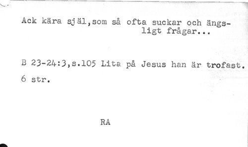 //// Ack kära själ,som så ofta suckar och ängs- //// ligt frågar... //// B 23-24:3,s.l05 Lita på Jesus han är trofast. //// 6 str. //// RA //// ! ////
