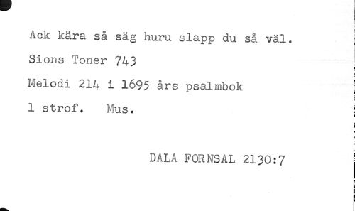 //// Ack kära så säg huru slapp du så väl. //// Sions Toner 743 //// Melodi 214 i 1695 års psalmbok //// * //// ! //// 1 strof. Mus. : //// i //// i //// DALA FORMSAL 2130:7 //// ä //// i //// H //// - ////
