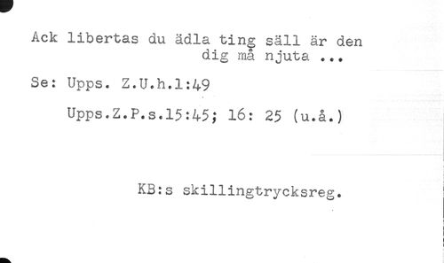 //// Ack libertas du ädla ting såll är den //// dig må njuta ... //// Se: Upps. Z.U.h.l:49 //// Upps.Z.P.s.15:45; 16: 25 (u.å.) //// < //// KB:s skillingtrycksreg. //// i //// ! //// i ////