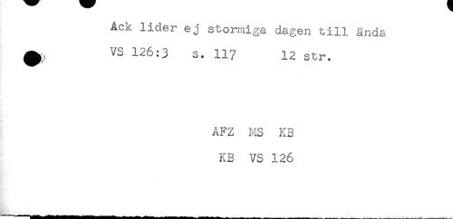 //// Ack lider ej stormiga dagen till ända //// ^ VS 126:3 s. 117 12 str. //// AFZ MS KB //// KB VS 126 //// '- .....-.... - -..... ..... ////