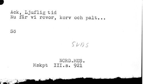 //// Ack, Ljuflig tid //// Nu får vi rovor, korv och palt... //// Sö //// NORD.MUS. //// Mskpt III.s. 921 ////