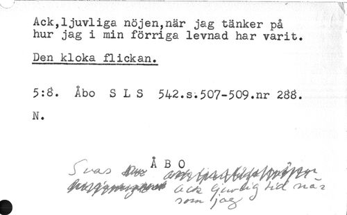 //// Ack,ljuvliga nöjen,när jag tänker på //// hur jag i min förriga levnad har varit. //// Den kloka flickan. //// 5:8. Åbo S L S 542.s.507-509.nr 288. //// N. //// 6 ////
