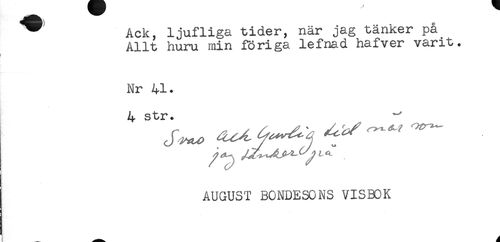//// ^ Ack, ljufliga tider, när jag tänker på //// Allt huru min föriga lefnad hafver varit. //// 7 //// Nr 41. //// 4 str. ^ //// ^ ^^^ ^ //// AUGUST BGNDESONS VISBOK ////