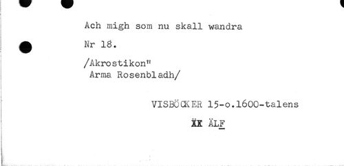 //// Ach migh som nu skall wandra //// ^ Nr 16. //// ^ /Akrostikon" //// Arma Rosenbladh/ //// i //// i //// VISBÖCKER 15-o.l600-talens //// iLK ÄLF //// ! //// H //// ! //// i ////