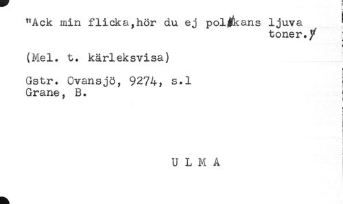 //// "Ack mm flicka,hör du ej polfkans ljuva ; //// toner./ //// (Mel. t. kärleksvisa) ! //// Gstr. Ovansjö, 9274* s.l I //// Grane, B. - //// t //// i //// U L M A ////
