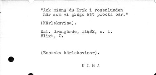 //// "Ack minns du Erik i rosenlunden //// ' när som vi gingo att plocka bär.** //// (Kärleksvisa). //// Dal. Grangärde, 11482, s. 1. //// Blixt, 0. //// (Enstaka kärleksvisor). //// U L M A ////