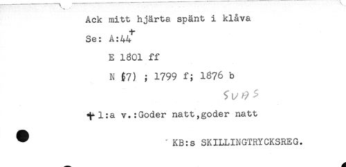 //// Ack mitt hjärta spant i klava //// Se: A:44** //// E 1801 ff //// N $7) ; 1799 f; 1876 b //// v.:Göder natt,göder natt //// ^ ^ KB:s SKILLINGTRYCKSREG. ////