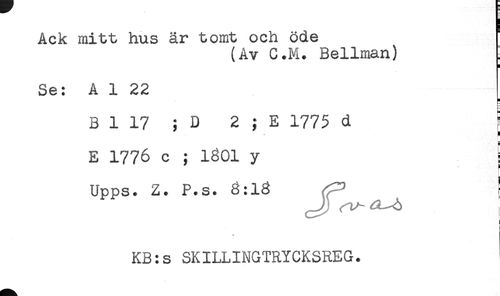 //// Ack mitt hus är tomt och öde //// (Av C.M. Bellman) //// Se: A 1 22 //// B 1 17 ; D 2 ; E 1775 d j //// E 1776 c ; 1801 y j //// Upps. Z. P.s. 8:18 } //// i //// KB:s SKILLINGTRYCKSREG. ////
